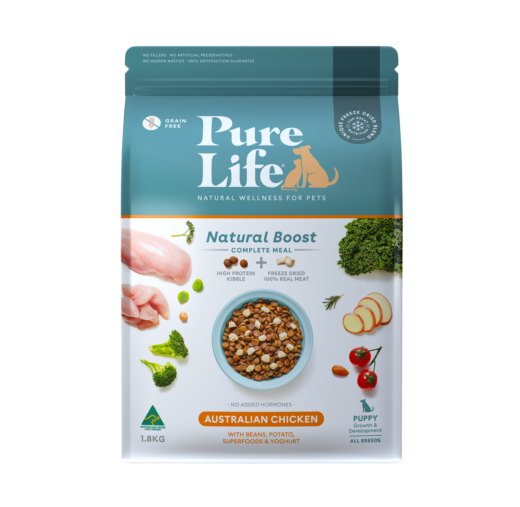 Pure Life Australian Chicken for Puppies with beans, potato, superfoods & yoghurt is a complete meal for puppies of all breeds.